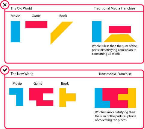 Transmedia: Las iniciativas, productos o narraciones Transmedia forman parte del relato y son concebidas como tal. Extienden la trama del eje principal a distintas plataformas y permiten desde el germen que los usuarios colaboren para ampliar su universo. La importancia de las narrativas Transmedia es que cada una de esas plataformas, ventanas, piezas o elementos forman parte de la historia y aportan al conjunto del relato y no están desvinculadas entre ellas. Así, cada parte de la narración es única por la propia esencia de la plataforma en la que se desarrolla (internet, cómics, redes sociales, videojuegos, juegos de mesa…), proporcionando unos recursos narrativos que crecen exponencialmente a medida que sabemos aprovechar las fortalezas de cada ventana y que sirven para que el espectador pueda tener diferentes puntos de entrada a la historia. En las narrativas Transmedia, los usuarios colaboran en la construcción del relato, lo que supone que éstos vivan una experiencia de inmersión plena en la historia. Como escribe Simon Sticker, Transmedia is about the story, not the tools”  (el Transmedia se refiere a la historia, no a las herramientas).